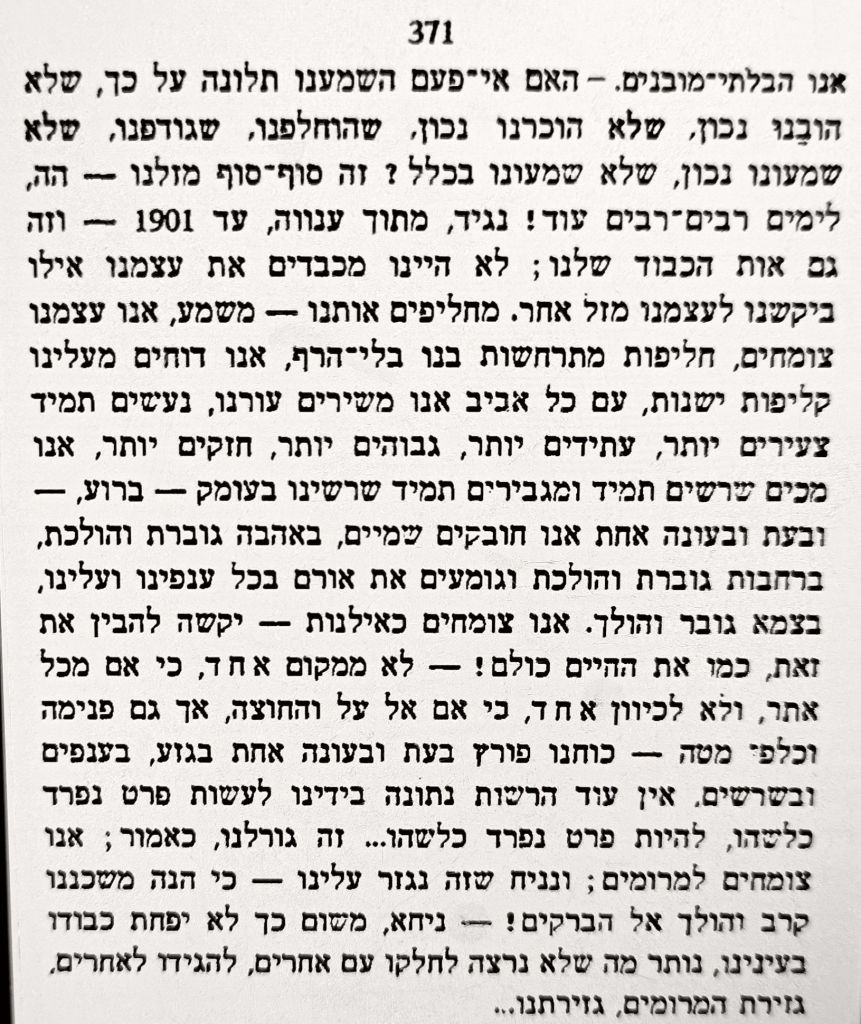 ולכן אי שם בקרקעית החשוכה הזאת, דוקא שם אפשר לפגוש את ה'צד השני' של המעגל…אמנם הניסיון והמלחמה גדולים, לטבוע בטיט היוון בעמקי המצולה של הכלום והשום דבר הצבאי ולהאבד לחלוטין. או למצוא שם ושם דייקא בירור חירות חדש ופלאי מאוד. חירות מעלמא דחירו. מהגבוה ביותר. מהבלתי מושג ונתפס בכלל. מושג חדש של חירות בכלל. ציור חדש של עולם חירות דוקא מעומק השיעבוד והנתינות…